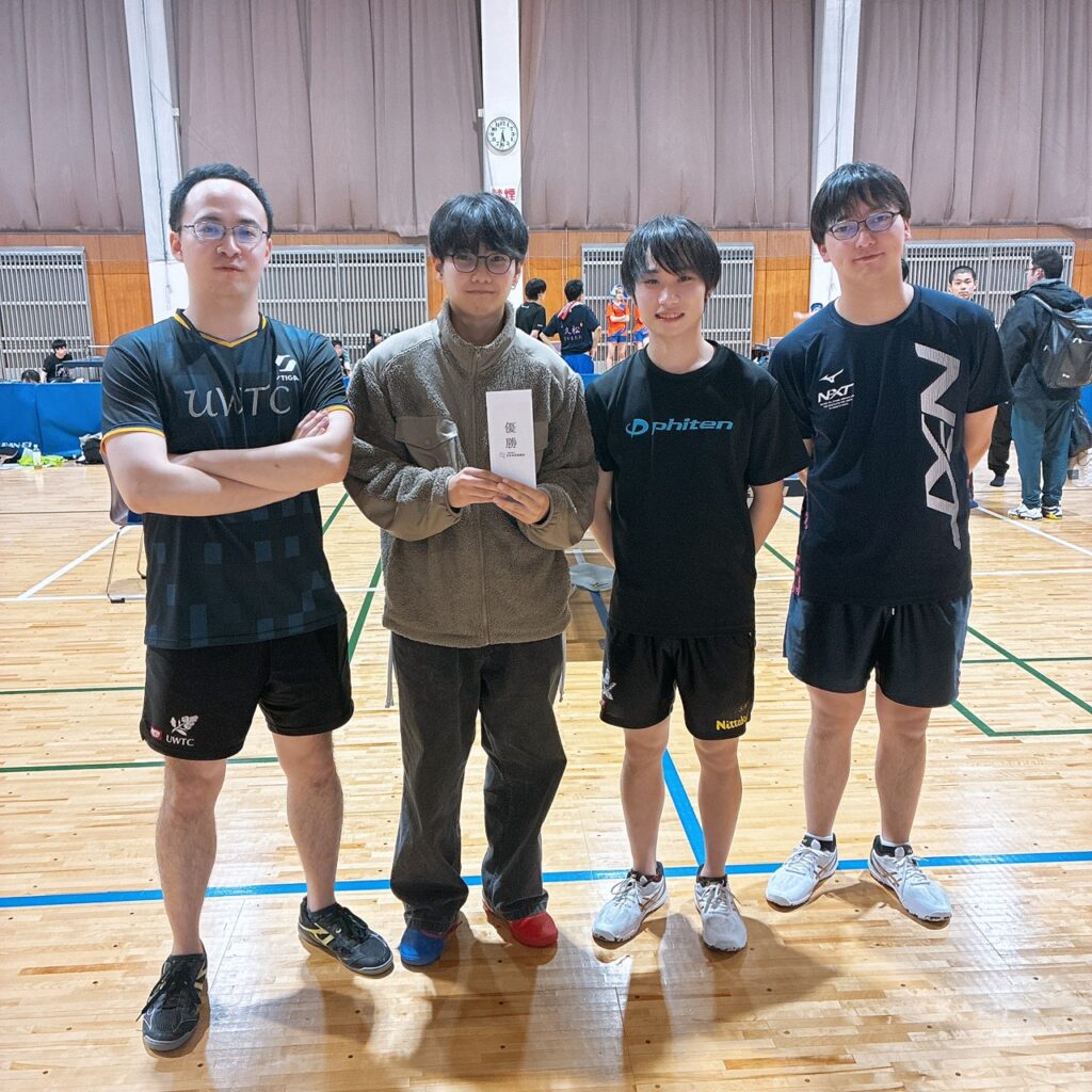 NEWS 2026年1月11日 第4回埼玉オープン卓球大会(団体の部) 結果 グループ1 優勝蝶峰クラブ グループ2 優勝那珂Vクラブ・UWTC グループ3 優勝法卓会B グループ4 優勝岩ちゃん御一行様 Share